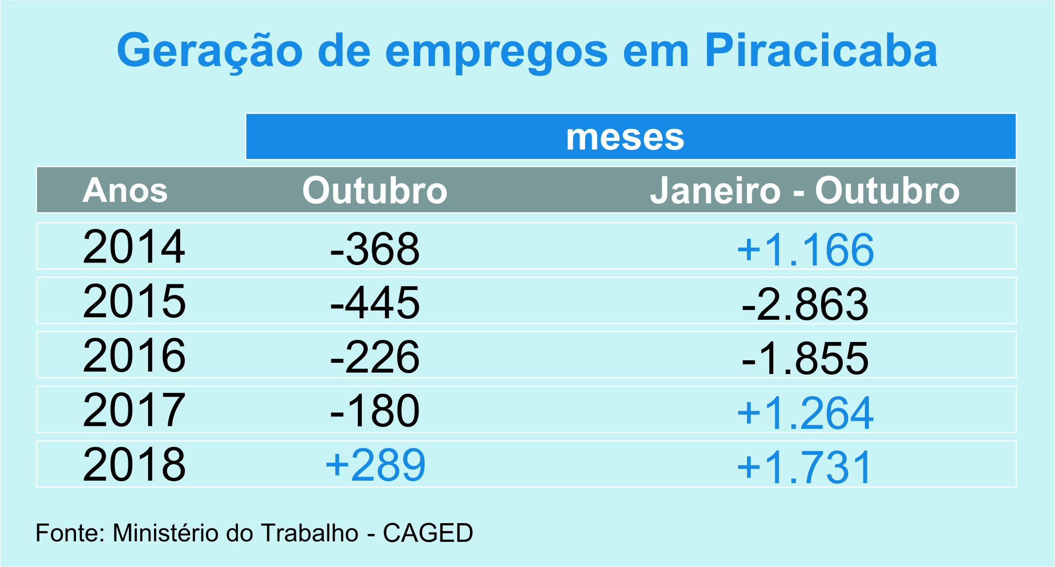Dados do Ministério do Trabalho confirmam a tendência de retomada de empregos em Piracicaba no mês de outubro, quando foram criadas 289 novas vagas. Com elas, os primeiros dez meses de 2018 registram 1.731 novos postos.