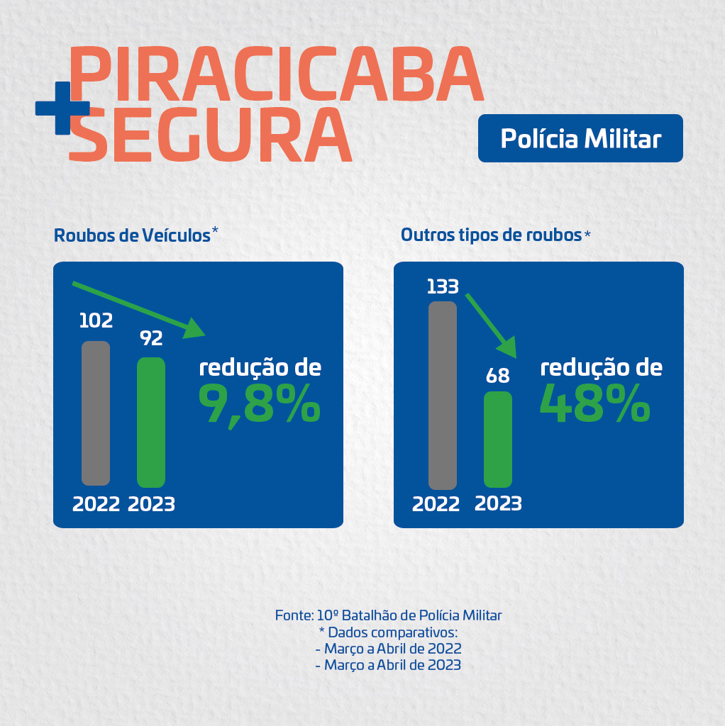 Conforme dados apresentados pelo 10º BPM-I, o número de roubos (residências, estabelecimentos comerciais e transeuntes) que entre março e abril de 2022 foi de 133, caiu para 68 no mesmo período de 2023, o que significa redução de 48%. O roubo de veículos, que em 2022 foi de 102, diminuiu para 92 neste ano, numa redução de 9,8%. Além disso, a Polícia Militar informou que conseguiu recuperar 45% dos veículos roubados.