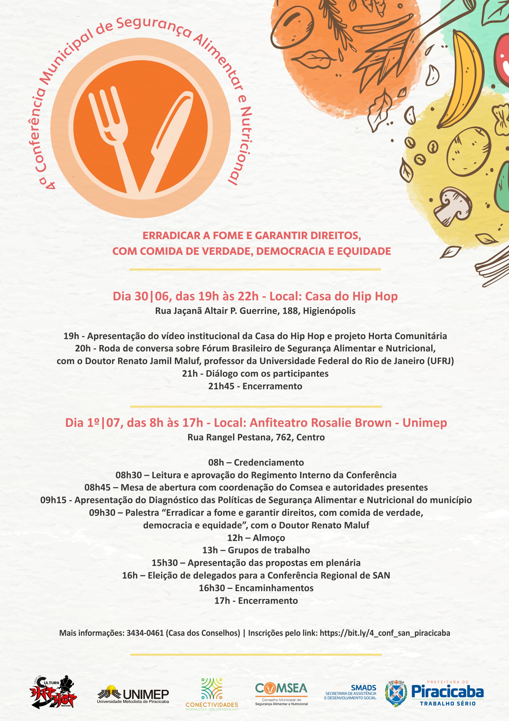Já no dia 1º/07, das 8h às 17h, no anfiteatro Rosalie Brown – Unimep Campus Centro, localizado na rua Rangel Pestana, 762, Centro, acontece a abertura oficial com autoridades e coordenação do Comsea, leitura e aprovação do Regimento Interno da Conferência; palestra com Renato Maluf, com o tema Erradicar a Fome e Garantir Direitos com Comida de Verdade, Democracia e Equidade; além da formação de grupos de trabalho, apresentação das propostas e eleição de delegados para a Conferência Regional de Segurança Alimentar e Nutricional (SAN).