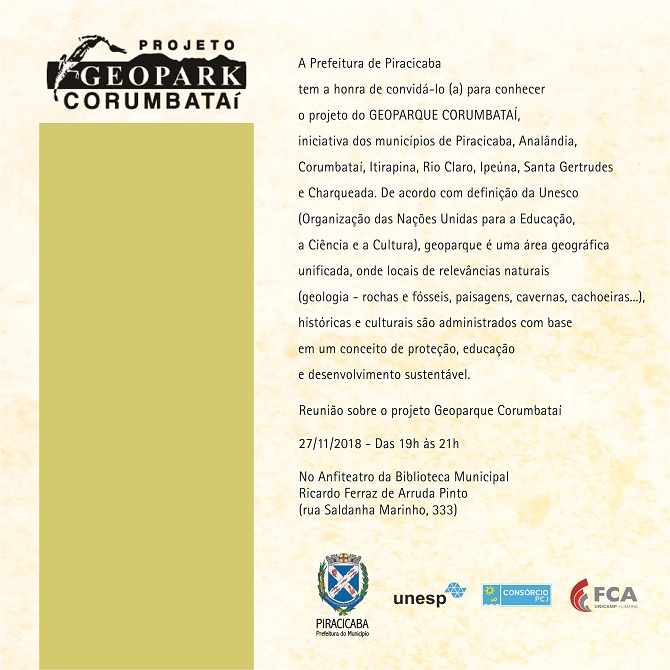 A Prefeitura de Piracicaba sedia, nesta terça-feira (27), a partir das 19h, apresentação sobre o Projeto Geoparque Corumbataí. O encontro acontece no Anfiteatro da Biblioteca Municipal, na Rua Saldanha Marinho, 333.