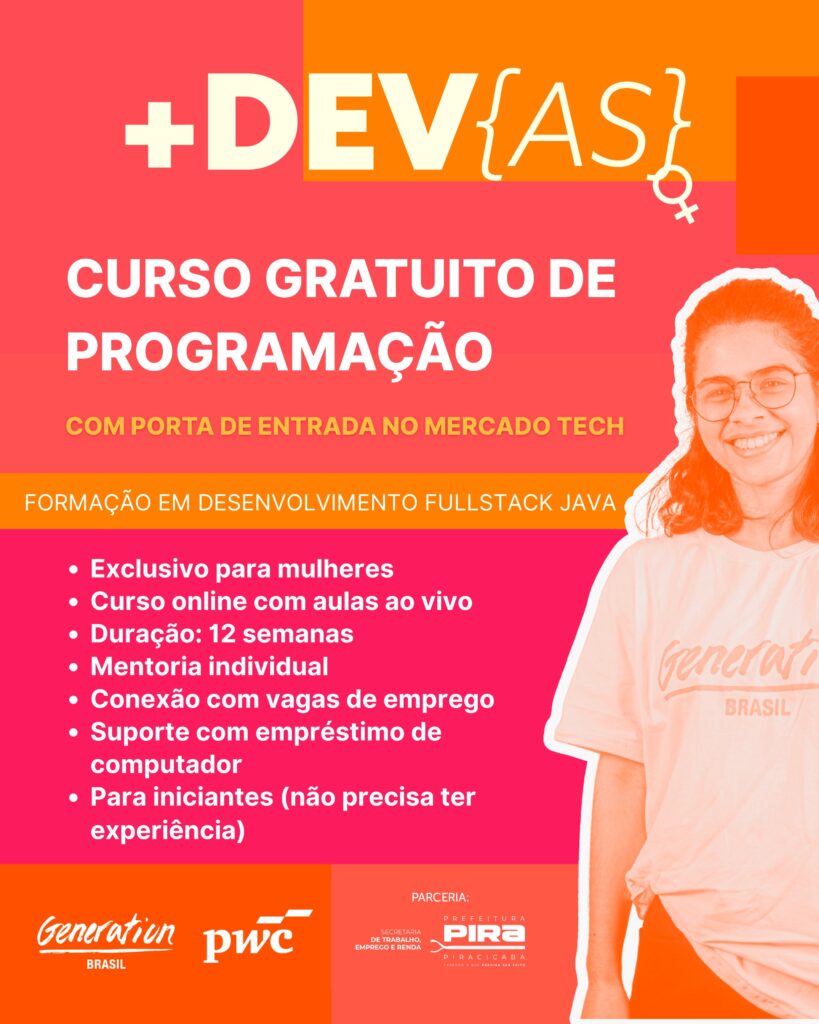 A Prefeitura de Piracicaba, por meio da Secretaria de Trabalho, Emprego e Renda, e em parceria com empresa PwC DTS Brasil e a Generation Brasil, está com inscrições abertas para uma turma do curso gratuito de Programação (Desenvolvimento Fullstack em Java) voltada exclusivamente para mulheres. A formação será totalmente online e destinada a moradoras de Piracicaba e cidades da região, com ensino médio completo e idade a partir de 18 anos.