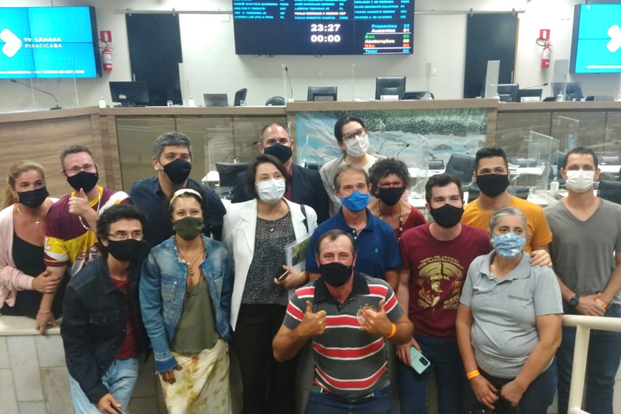 Secretária Nancy Thame, vereadores e agricultores apoiadores do projeto, após votação na Câmara