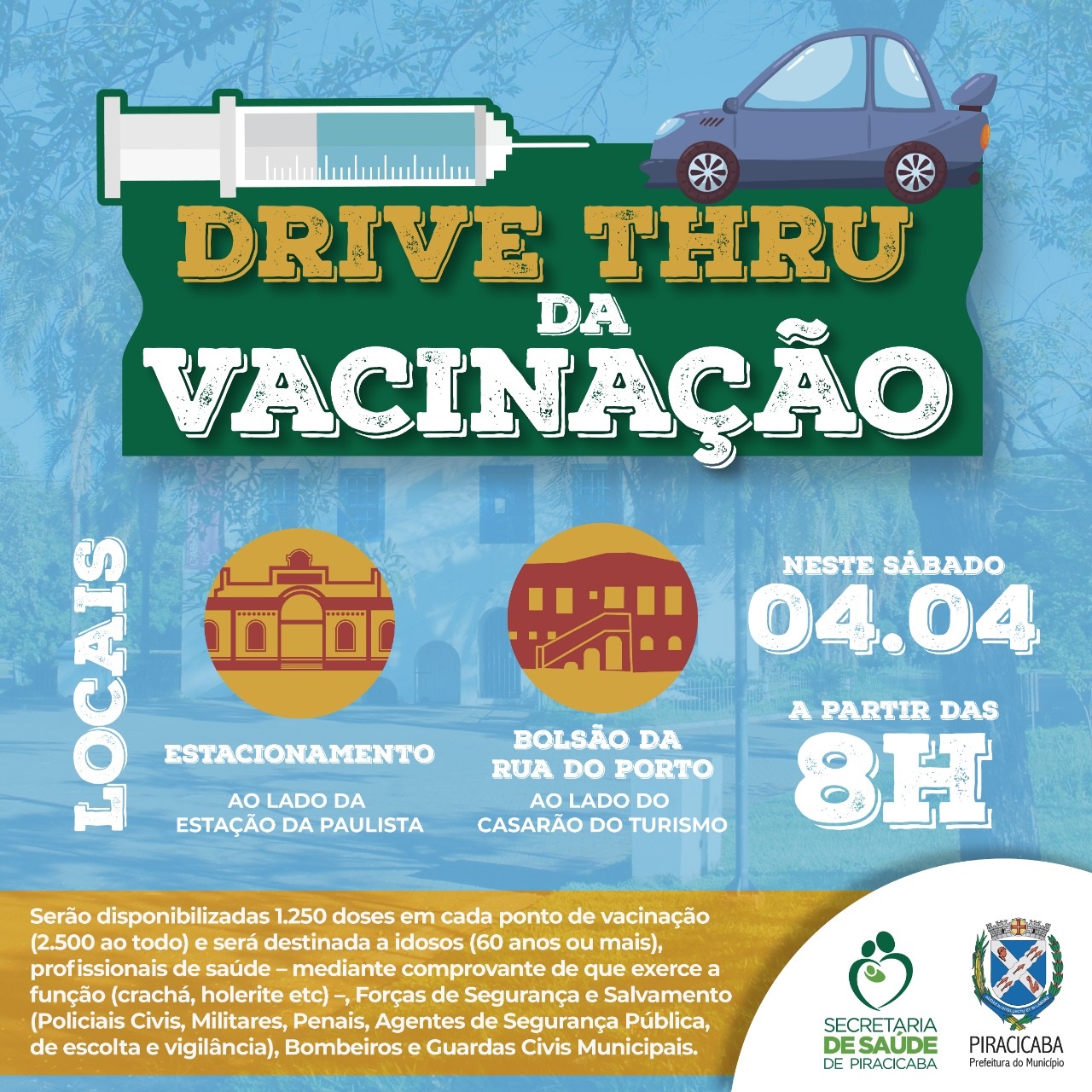 A vacina contra a gripe (influenza) será fornecida no sistema 'drive thru' em Piracicaba, no sábado (04/04). A pessoa não precisará sair do veículo para receber a dose. Um profissional da saúde vai até ela. Trata-se de mais uma estratégia elaborada pela Prefeitura, por meio da Secretaria Municipal de Saúde, com o objetivo de evitar aglomerações de pessoas nesse momento de pandemia do coronavírus.