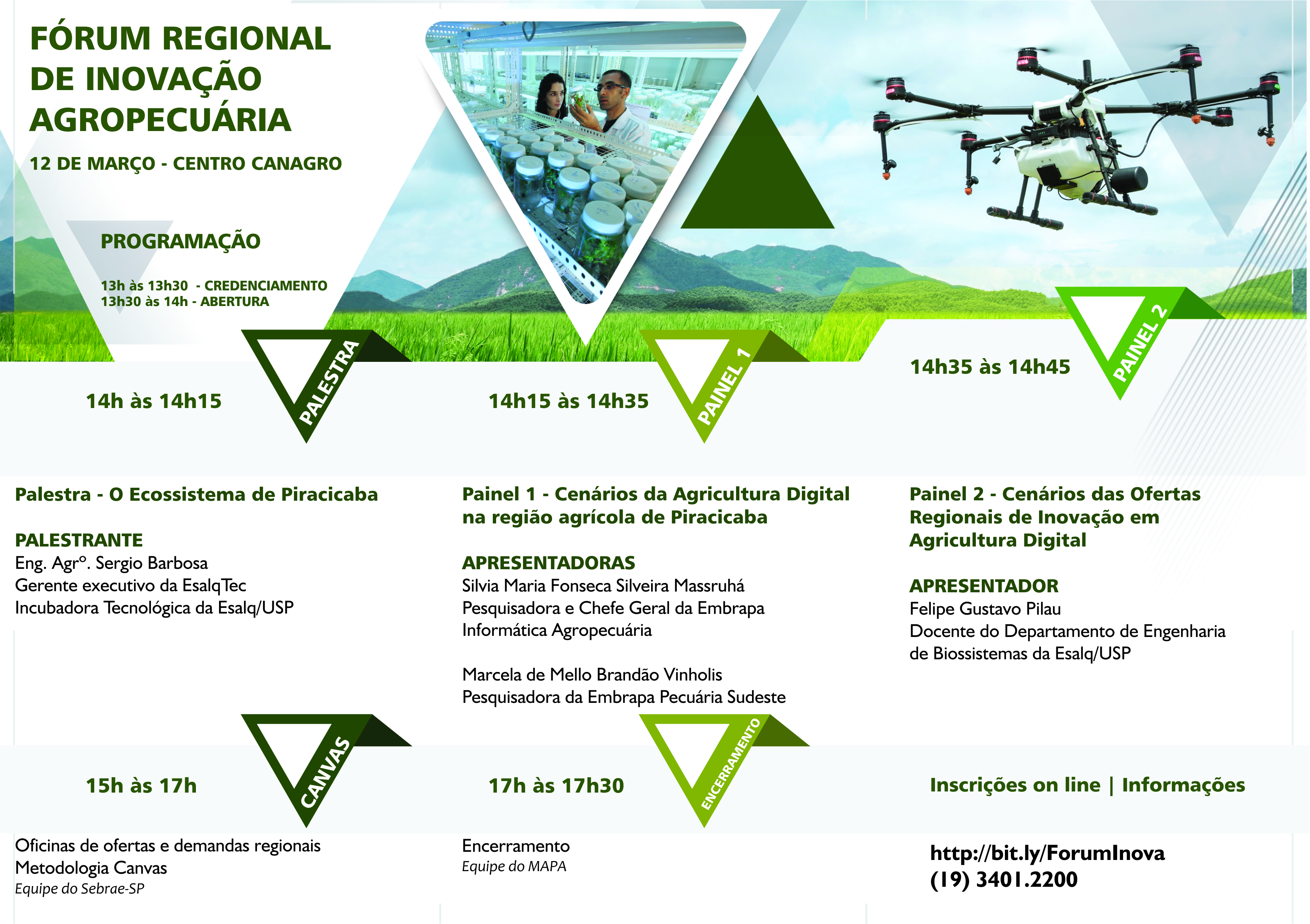SERVIÇO – Fórum Regional de Inovação Agropecuária (FIA). Dia 12/03. Credenciamento a partir das 13h30, no anfiteatro do Centro Canagro José Coral, avenida Luciano Guidotti, 1.937, Caxambu, Piracicaba. Inscrições online podem ser feitas no link bit.ly/ForumInova. Informações pelo telefone (19) 3401-2200.