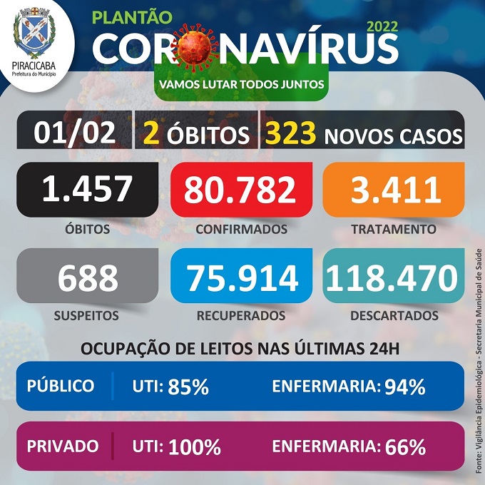 A Secretaria da Saúde registrou 2 óbitos: 2 homens de 86 e 88 anos 80.782 casos confirmados 688 casos suspeitos 118.470 casos descartados 75.914 casos recuperados 3.411 pessoas em tratamento Óbitos – 1.457 A cidade tem 323 novos casos confirmados, sendo: 122 homens de 02 a 88 anos 201 mulheres de 01 a 90 anos Taxa de ocupação de UTI-SUS: 85% Taxa de ocupação de enfermaria-SUS: 94% Taxa de ocupação de UTI-PRIVADO: 100% Taxa de ocupação de enfermaria-PRIVADO: 66%