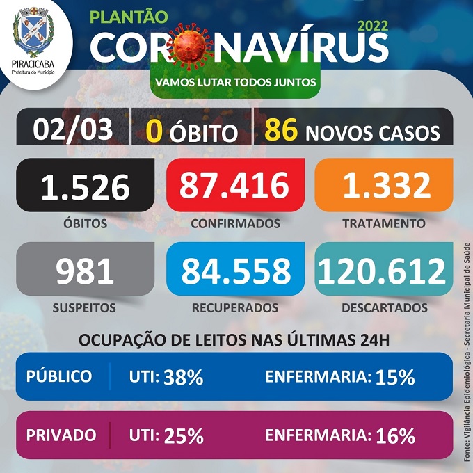 A Secretaria da Saúde não registrou óbitos 87.416 casos confirmados 981 casos suspeitos 120.612 casos descartados 84.558 casos recuperados 1.332 pessoas em tratamento Óbitos – 1.526 A cidade tem 86 novos casos confirmados, sendo: 37 homens de 02 a 93 anos 49 mulheres de 04 a 96 anos Taxa de ocupação de UTI-SUS: 38% Taxa de ocupação de enfermaria-SUS: 15% Taxa de ocupação de UTI-PRIVADO: 25% Taxa de ocupação de enfermaria-PRIVADO: 16%