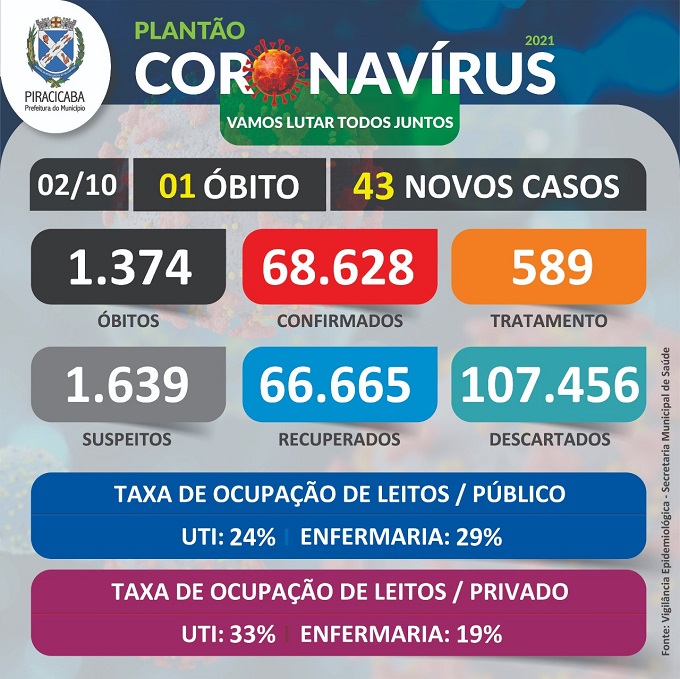Taxa de ocupação de UTI-SUS: 24% Taxa de ocupação de enfermaria-SUS: 29% Taxa de ocupação de UTI-PRIVADO: 33% Taxa de ocupação de enfermaria-PRIVADO: 19%