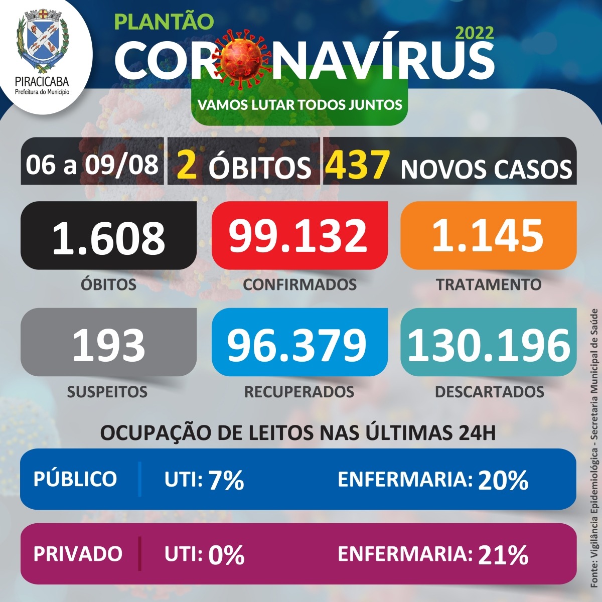 A cidade tem 437 novos casos confirmados, entre os dias 06/08 a 09/08, sendo: