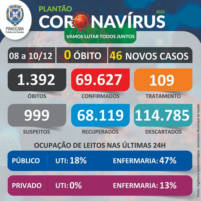 A Secretaria da Saúde não registrou óbitos 69627 casos confirmados 999 casos suspeitos 114785 casos descartados 68119 casos recuperados 109 pessoas em tratamento Óbitos – 1.392 A cidade tem 46 novos casos confirmados, entre os dias 08 a 10/12, sendo: