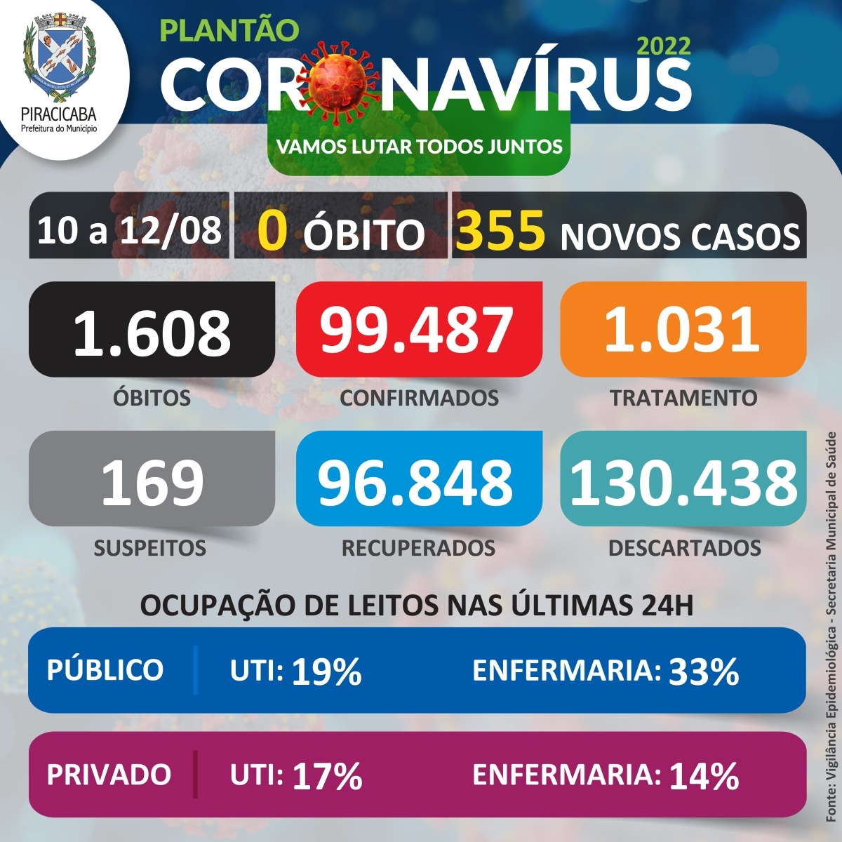 A cidade tem 355 novos casos confirmados, entre os dias 10/08 a 12/08, sendo: