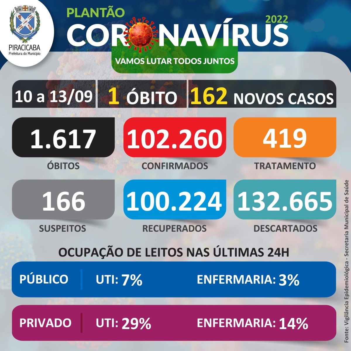 A cidade tem 162 novos casos confirmados, entre os dias 10/09 a 13/09, sendo: