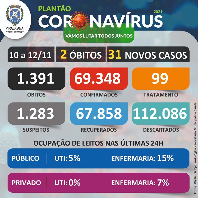 A cidade tem 31 novos casos confirmados, entre os dias 10/11 e 12/11, sendo: