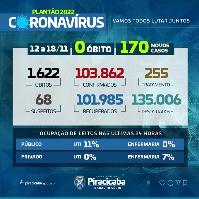 A cidade tem 170 novos casos confirmados, entre os dias 12/11 a 18/11/2022, sendo: