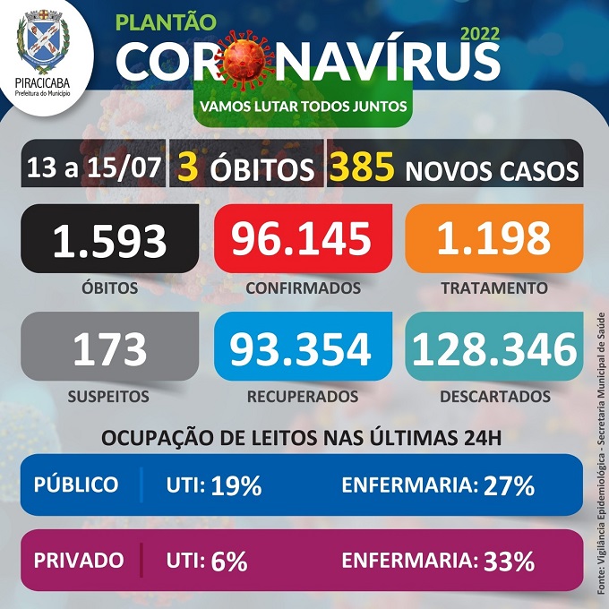 A cidade tem 385 novos casos confirmados, entre os dias 13/07 a 15/07/2022, sendo: