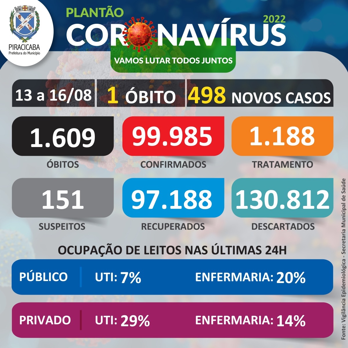 A cidade tem 498 novos casos confirmados, entre os dias 13/08 a 16/08, sendo: