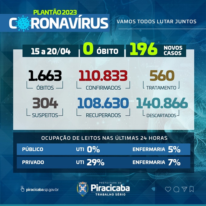 A cidade tem 196 novos casos confirmados, entre os dias 15/04 a 20/04/2023, sendo: