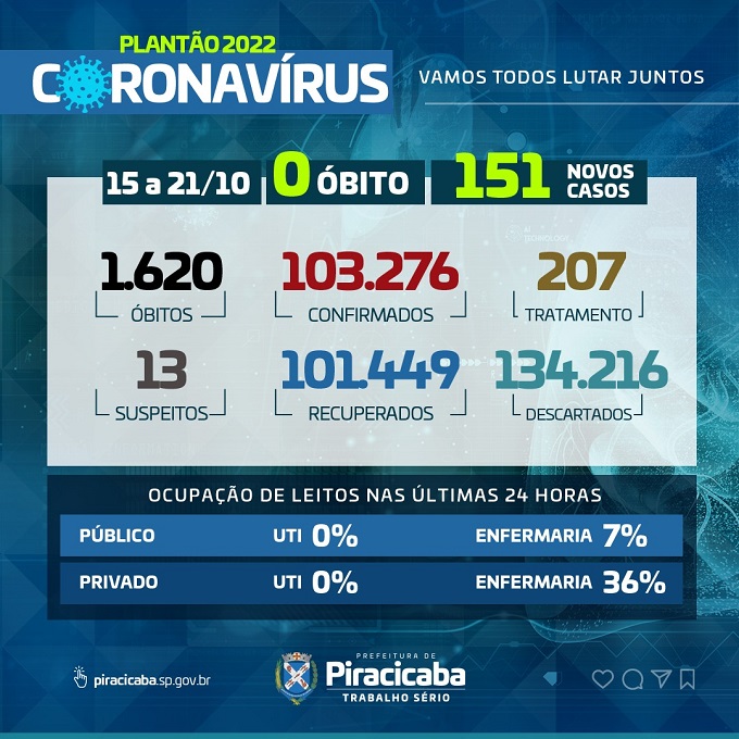 A cidade tem 151 novos casos confirmados, entre os dias 15/10 a 21/10/2022, sendo: