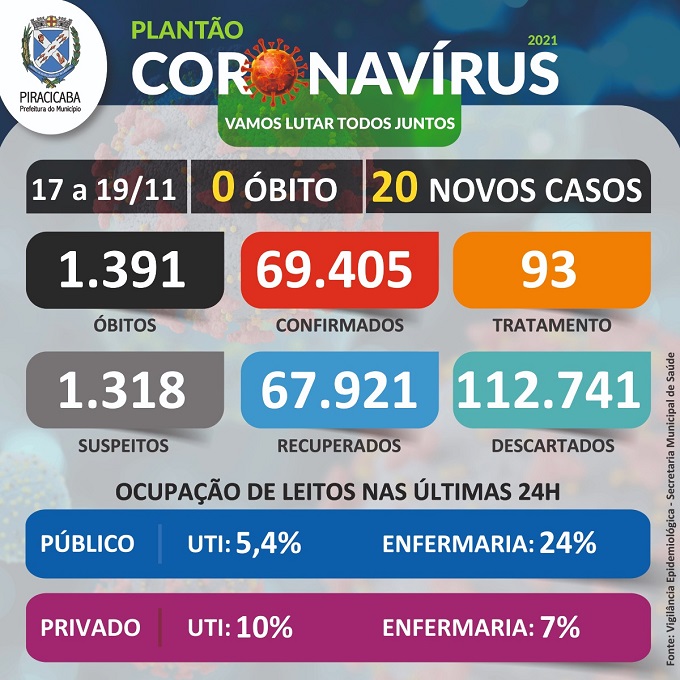 69405 casos confirmados 1318 casos suspeitos 112741 casos descartados 67921 casos recuperados 93 pessoas em tratamento Óbitos – 1391 A cidade tem 20 novos casos confirmados, entre os dias 17/11 e 19/11, sendo:
