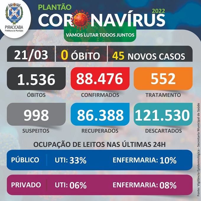 A Secretaria da Saúde não registrou óbitos 88.476 casos confirmados 998 casos suspeitos 121.530 casos descartados 86.388 casos recuperados 552 pessoas em tratamento Óbitos – 1.536 A cidade tem 45 novos casos confirmados, sendo: 19 homens de 01 a 60 anos 26 mulheres de 06 a 81 anos Taxa de ocupação de UTI-SUS: 33% Taxa de ocupação de enfermaria-SUS: 10% Taxa de ocupação de UTI-PRIVADO: 06% Taxa de ocupação de enfermaria-PRIVADO: 08%