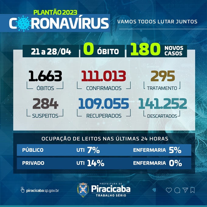 A cidade tem 180 novos casos confirmados, entre os dias 21/04 a 28/04/2023, sendo: