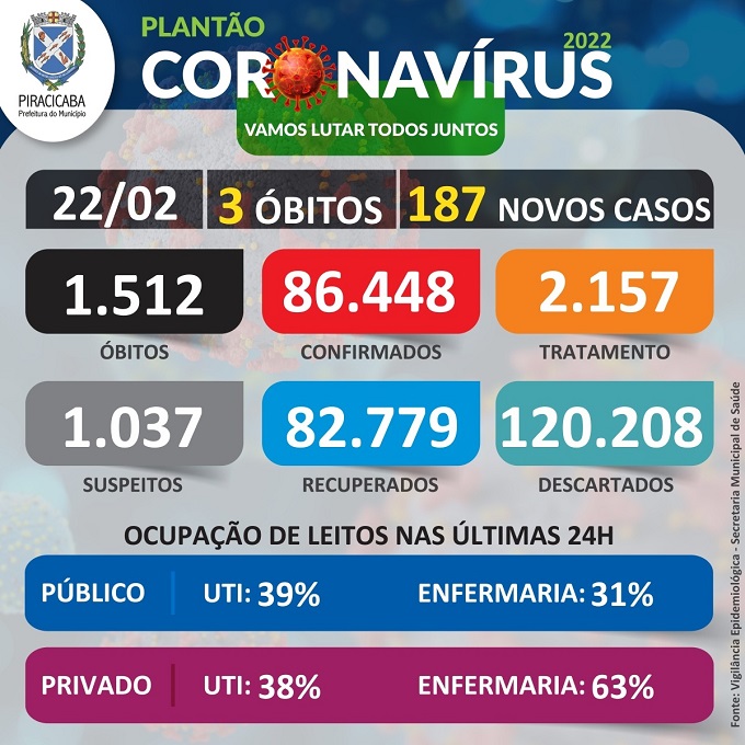 PLANTÃO CORONAVÍRUS – 22/02/2022 A Secretaria da Saúde registrou 4 óbitos: 1 homem de 85 anos e 3 mulheres de 55, 67 e 78 anos. 86.448 casos confirmados 1.037 casos suspeitos 120.208 casos descartados 82.779 casos recuperados 2.157 pessoas em tratamento Óbitos – 1.512 A cidade tem 187 novos casos confirmados, sendo: 78 homens de 01 a 91 anos 109 mulheres de 03 a 75 anos Taxa de ocupação de UTI-SUS: 39% Taxa de ocupação de enfermaria-SUS: 31% Taxa de ocupação de UTI-PRIVADO: 38% Taxa de ocupação de enfermaria-PRIVADO: 63%