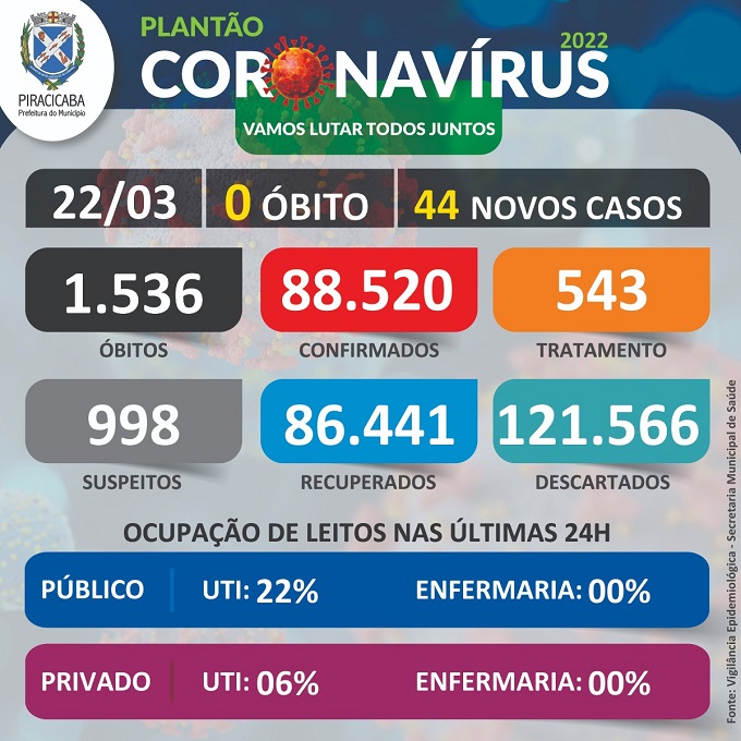 A Secretaria da Saúde não registrou óbitos 88.520 casos confirmados 998 casos suspeitos 121.566 casos descartados 86.441 casos recuperados 543 pessoas em tratamento Óbitos – 1.536 A cidade tem 44 novos casos confirmados, sendo: 26 homens de 07 a 74 anos 18 mulheres de 04 a 60 anos Taxa de ocupação de UTI-SUS: 22% Taxa de ocupação de enfermaria-SUS: 00% Taxa de ocupação de UTI-PRIVADO: 06% Taxa de ocupação de enfermaria-PRIVADO: 00%