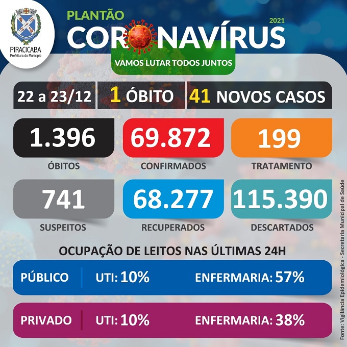 A cidade tem 41 novos casos confirmados, entre os dias 22 a 23/12, sendo: