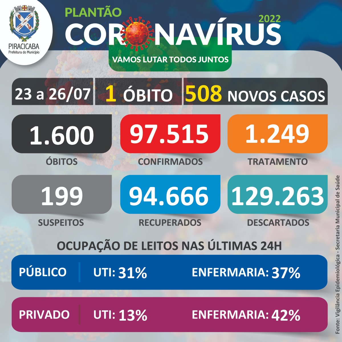 A cidade tem 508 novos casos confirmados, entre os dias 23/07 a 26/07, sendo: