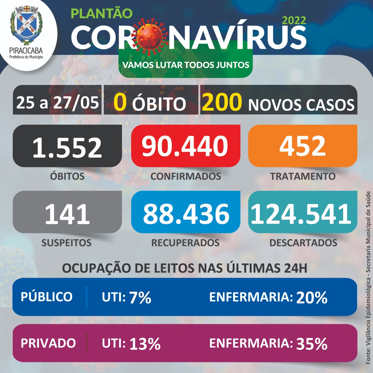 A cidade tem 200 novos casos confirmados, entre os dias 25/05 a 27/05, sendo: