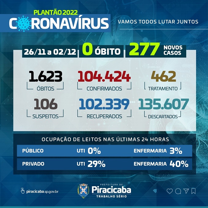 A cidade tem 277 novos casos confirmados, entre os dias 26/11 a 02/12/2022, sendo: