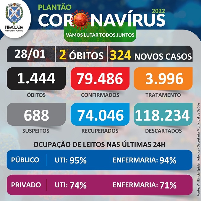 A Secretaria da Saúde registrou 2 óbitos: 1 homem de 87 anos e 1 mulher de 75 anos 79.486 casos confirmados 688 casos suspeitos 118.234 casos descartados 74.046 casos recuperados 3.996 pessoas em tratamento Óbitos – 1.444 A cidade tem 324 novos casos confirmados, sendo: 123 homens de 03 a 82 anos 201 mulheres de 01 a 90 anos Taxa de ocupação de UTI-SUS: 95% Taxa de ocupação de enfermaria-SUS: 94% Taxa de ocupação de UTI-PRIVADO: 74% Taxa de ocupação de enfermaria-PRIVADO: 71%