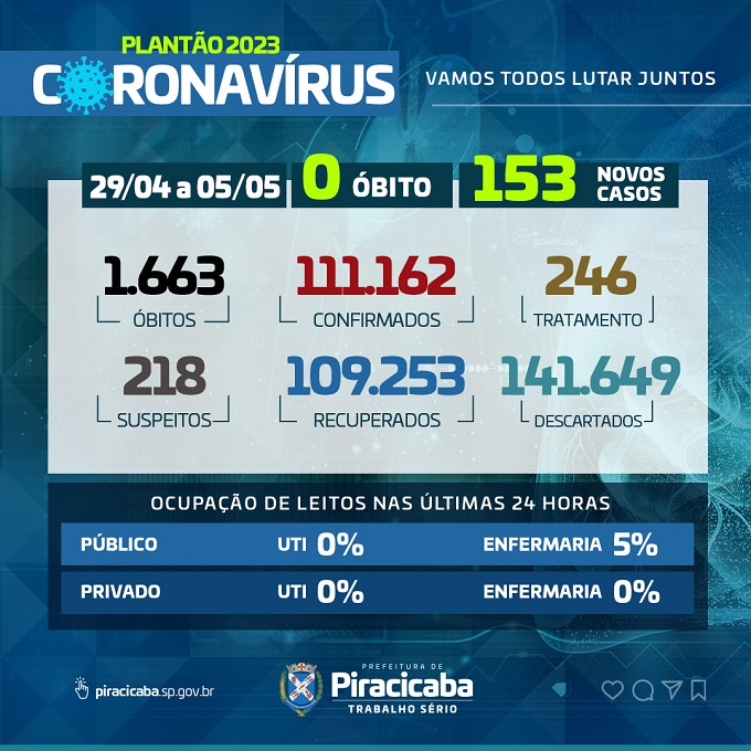 A cidade tem 153 novos casos confirmados, entre os dias 29/04 a 05/05/2023, sendo: