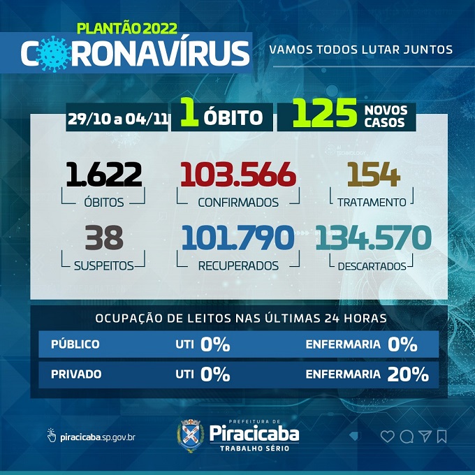 A cidade tem 125 novos casos confirmados, entre os dias 29/10 a 04/11/2022, sendo: