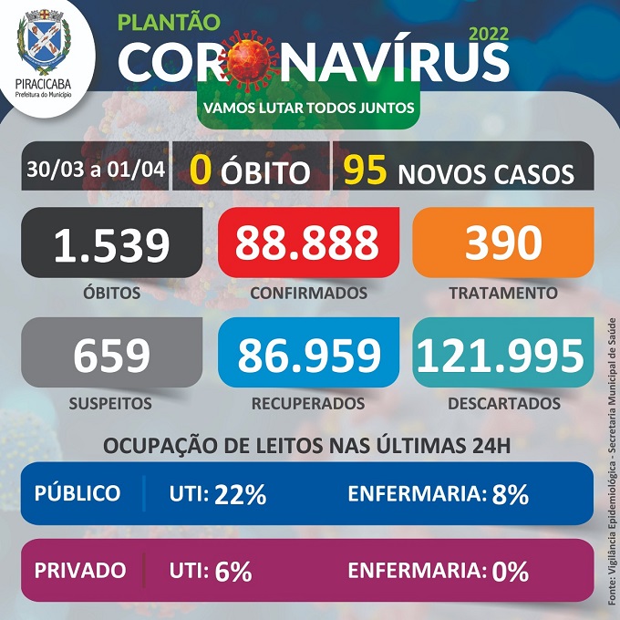 A cidade tem 95 novos casos confirmados, entre os dias 30/03 a 01/04, sendo: