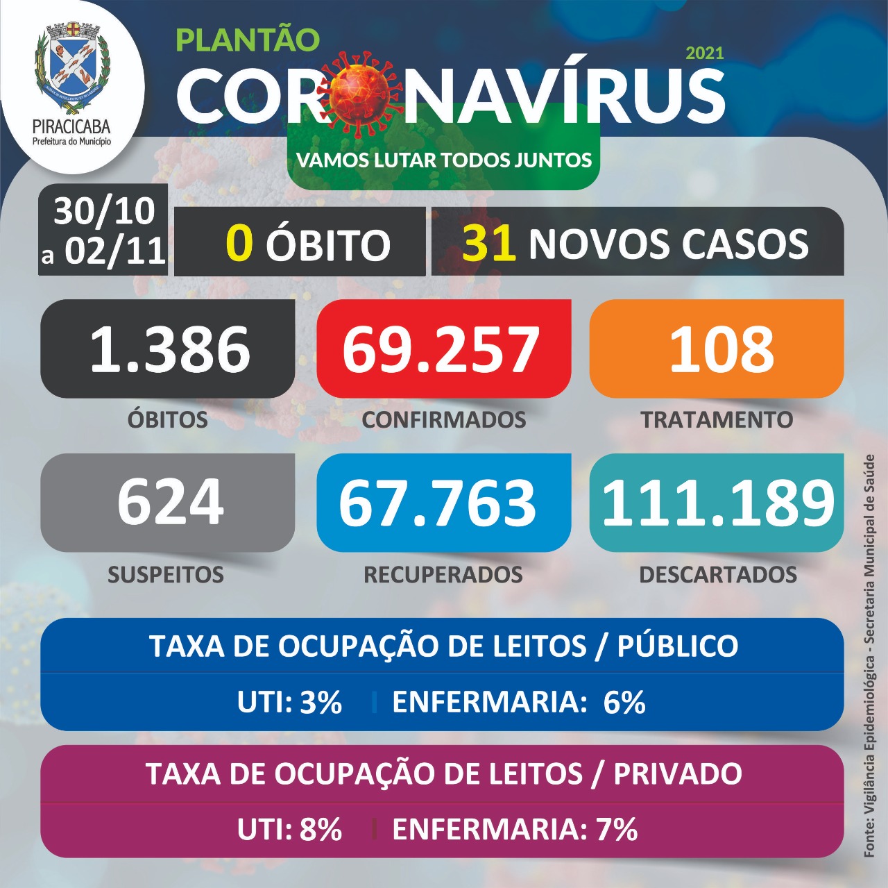 A cidade tem 31 novos casos confirmados, entre os dias 30/10 a 02/11, sendo: