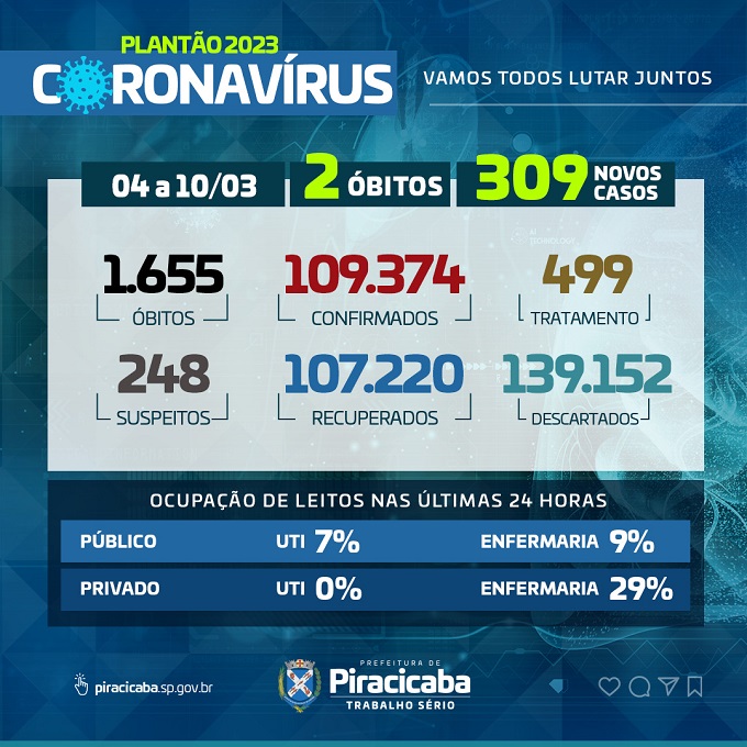 A cidade tem 309 novos casos confirmados, entre os dias 04/03 a 10/03/2023, sendo