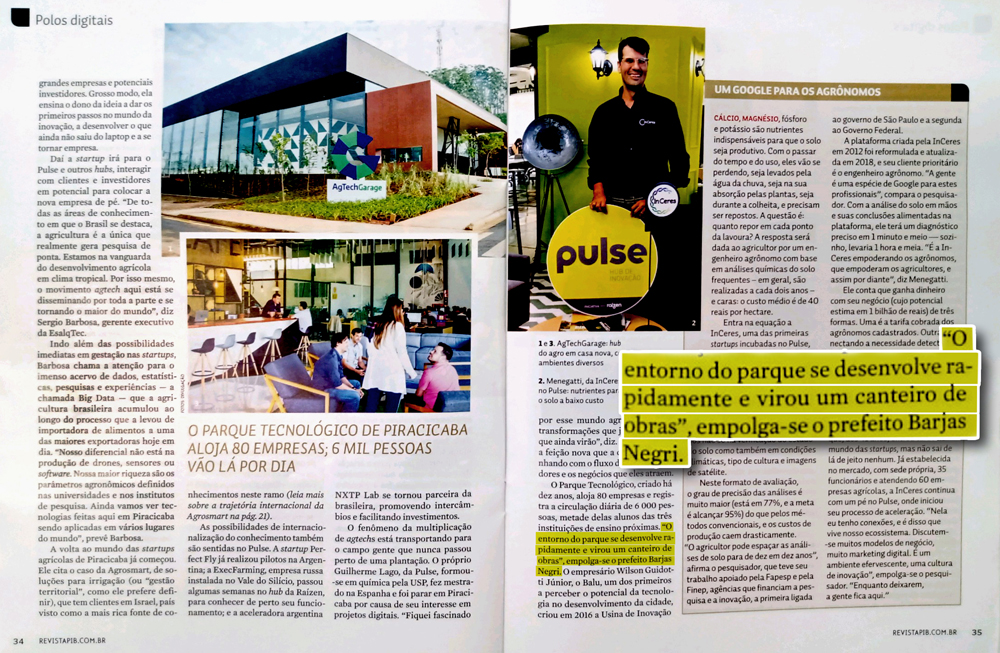 O prefeito Barjas Negri foi um dos entrevistados da PIB. Ele falou sobre o Parque Tecnológico, criado em uma de suas gestões e que atraiu mais empresas para suas instalações e em terrenos vizinhos, como o caso do Centro Administrativo da Raízen. “Esse incentivo iniciado com o Parque Tecnológico deu um dinamismo diferente para Piracicaba e ela acabou se voltando para o que já tinha de excelência, que era o agronegócio. O reconhecimento desse potencial de Piracicaba com seus hubs e suas agtechs foi esmiuçado com excelência nas reportagens da PIB. Vale muito a pena a leitura”, convida Barjas.