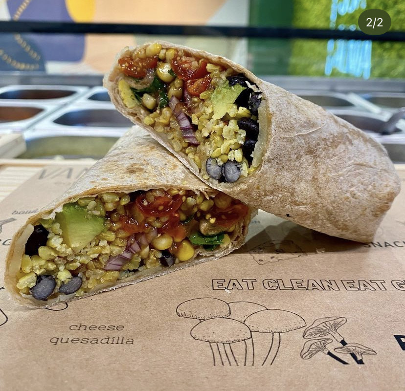 Burrito da Vanilla Eat Energize, com arroz cateto integral, abacate, vinagrete, feijão preto, milho e molho BBQ