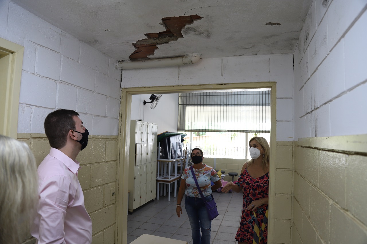 O secretário de Educação Bruno Roza em visita à sede da EM. Bruna Ferreira da Silva, que conta com problemas estruturais severos.