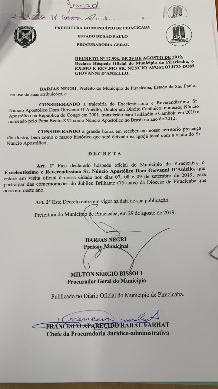 Por meio do Decreto 17.996, assinado pelo prefeito Barjas Negri nesta quinta-feira, dia 29 de agosto, será considerado hóspede oficial do município de Piracicaba o reverendo Núncio Apostólico Dom Giovanni D'Aniello, por ocasião de sua visita a cidade. A autoridade católica estará em Piracicaba nos dias 7, 8 e 9 de setembro, em virtude do Jubileu Brilhante, que marca as celebrações pelos 75 anos da Diocese de Piracicaba, comemorado neste ano.