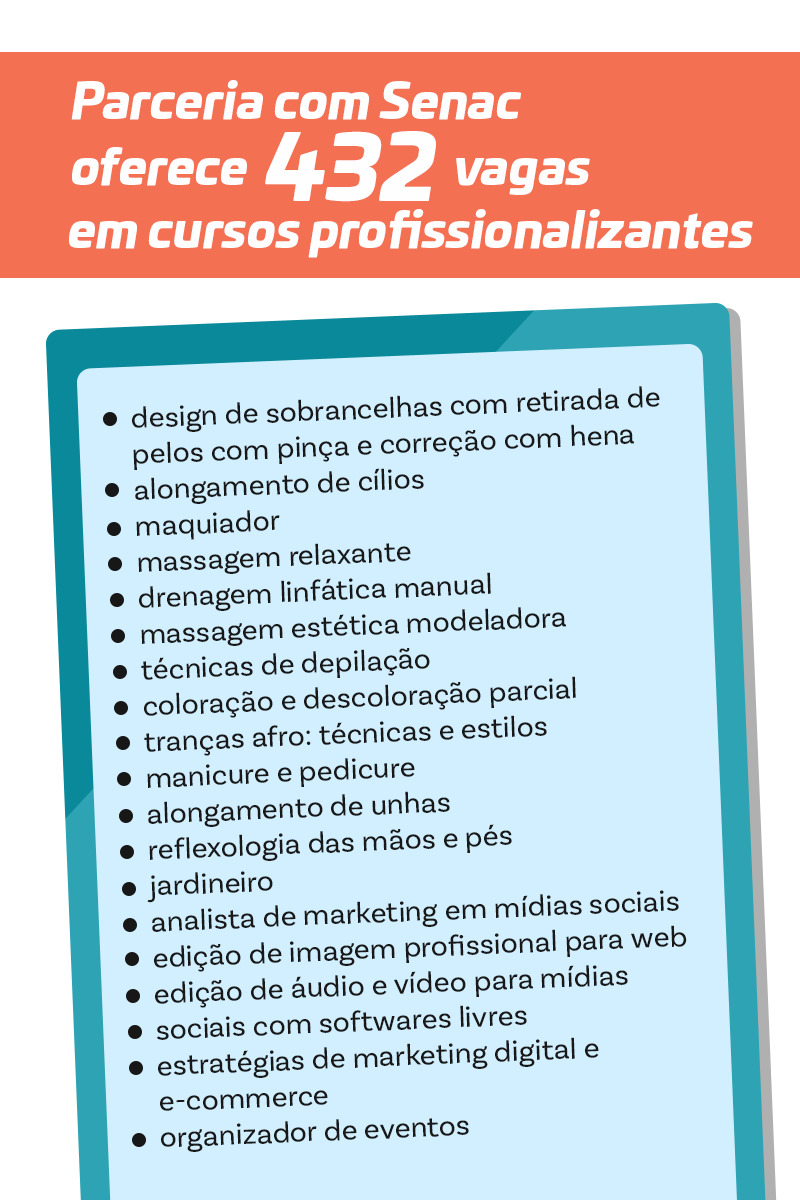 Os cursos oferecidos pela parceria entre Semdettur e Senac são design de sobrancelhas, alongamento de cílios, maquiador, massagem relaxante, drenagem linfática manual, massagem estética modeladora, técnicas de depilação, coloração e descoloração parcial, tranças afro: técnicas e estilos, manicure e pedicure, alongamento de unhas, reflexologia das mãos e pés, jardineiro, analista de marketing em mídias sociais, edição de imagem profissional para web, edição de áudio e vídeo para mídias sociais com softwares livres, estratégias de marketing digital ee-commerce e organizador de eventos