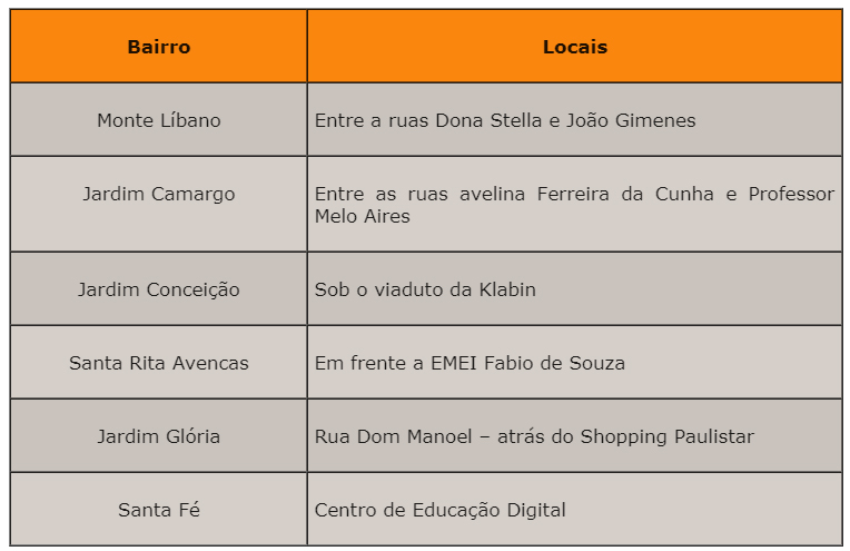No pacote, será construída uma escada para ligar as ruas Dona Stella e João Gimenes, no bairro Monte Líbano. Segundo a Secretaria Municipal de Obras (Semob), ela é necessária para vencer um desnível de cerca de 12 metros de altura. Sua extensão será de cerca de 50 metros e ela estará equipada com corrimão. Outra escada vai ligar as ruas Avelina Ferreira da Cunha e Professor Melo Aires, no Jardim Camargo. Esta ajudará os pedestres a vencer um desnível de cerca de 11 metros e sua extensão horizontal será de aproximadamente 40 metros, com instalação de corrimão. Duas rampas serão instaladas em frente à EMEI Fabio de Souza, no bairro Santa Rita Avencas, que vai possibilitar a travessia de canteiro central para acesso à escola. Outra rampa será construída em frente ao Centro de Educação Digital, no Santa Fé.