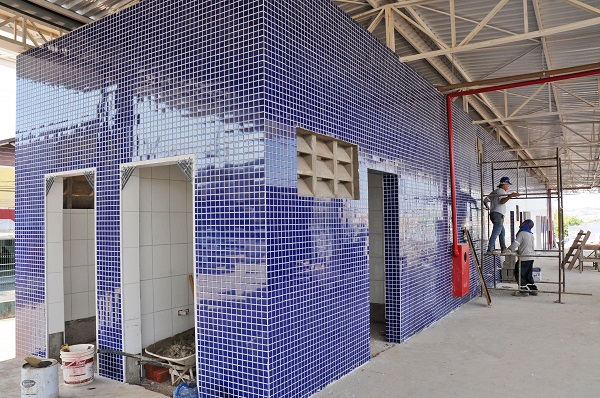 No bloco de apoio aos funcionários foi concluído assentamento de pastilhas e revestimento interno e externo. A partir da próxima semana serão iniciados os serviços de calçamento no entorno e pavimentação asfáltica.