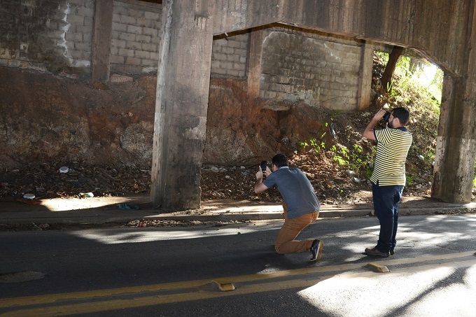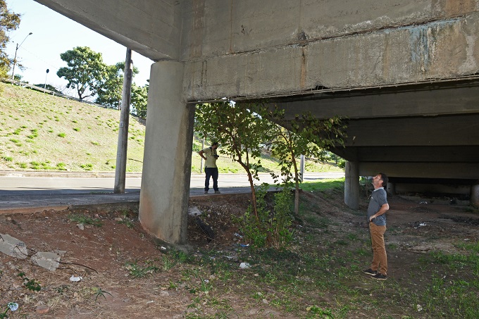 Os engenheiros Marcos Sartori e Lucas Barreira fazem a documentação do viaduto próximo à Coplacana
