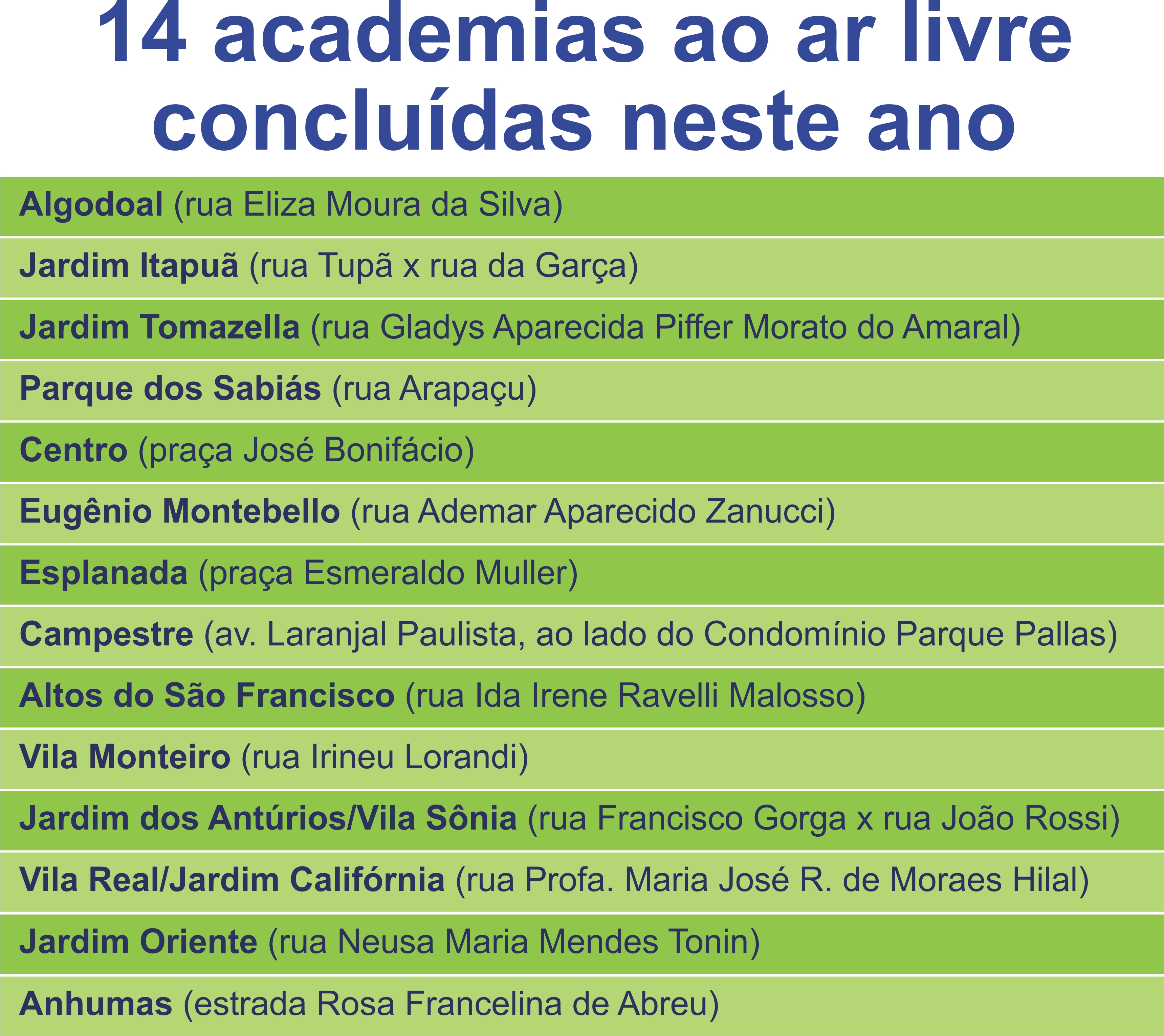 As novas academias ao ar livre foram instaladas nos seguintes bairros: Algodoal; Jardim Itapuã; Jardim Tomazella; Parque dos Sabiás; Centro (Praça José Bonifácio); Eugênio Montebello; Esplanada; Campestre; Altos do São Francisco; Vila Monteiro; Jardim dos Antúrios/Vila Sônia; Jardim Califórnia; Jardim Oriente e Anhumas.