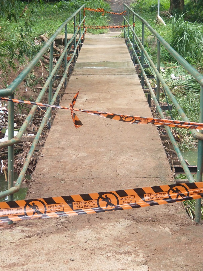 Também hoje, a Semozel fez outra placa de concreto e recolocou na passarela da avenida Francisco Abel Pereira, que foi interditada com faixas da Defesa Civil ontem, pois uma placa de cimento havia sido derrubada pela força das águas do córrego do Enxofre. A previsão é que a passagem seja liberada neste fim de semana, após a secagem do concreto.