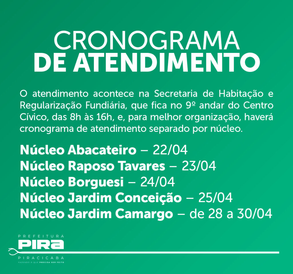 Para facilitar e agilizar o processo de regularização fundiária, os moradores dos 13 Núcleos Urbanos Informais de Interesse Social, contemplados com a regularização fundiária da Prefeitura de Piracicaba, agora podem entregar a documentação necessária para a titulação diretamente no Centro Cívico. O atendimento acontece na Secretaria de Habitação e Regularização Fundiária, que fica no 9º andar, das 8h às 16h, e, para melhor organização, haverá cronograma de atendimento separado por núcleo.