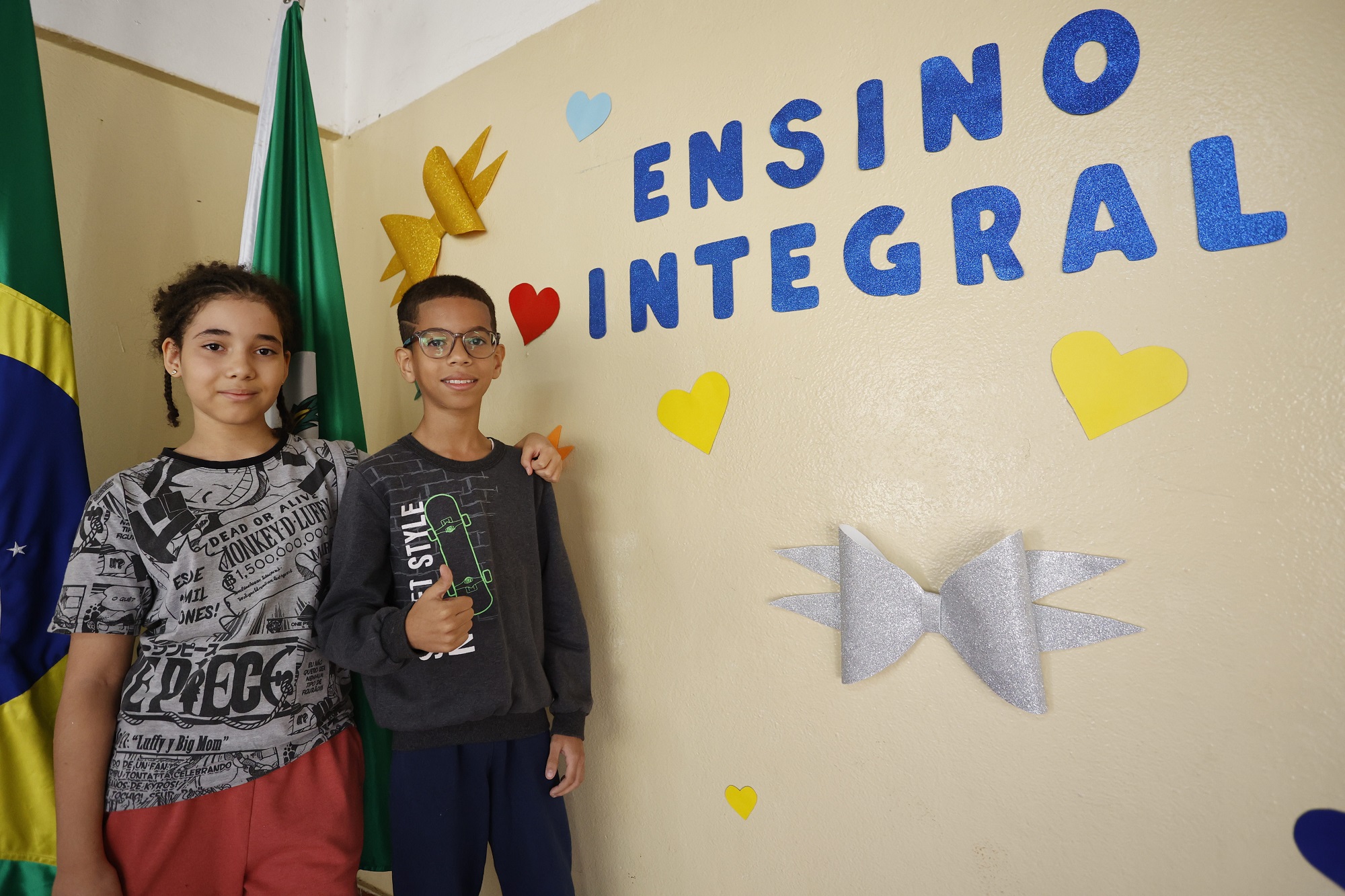 Helena Vicente e Arthur da Silva, alunos do 5º ano da EM Luiz Cláudio Alves, estão empolgados com o ensino integral