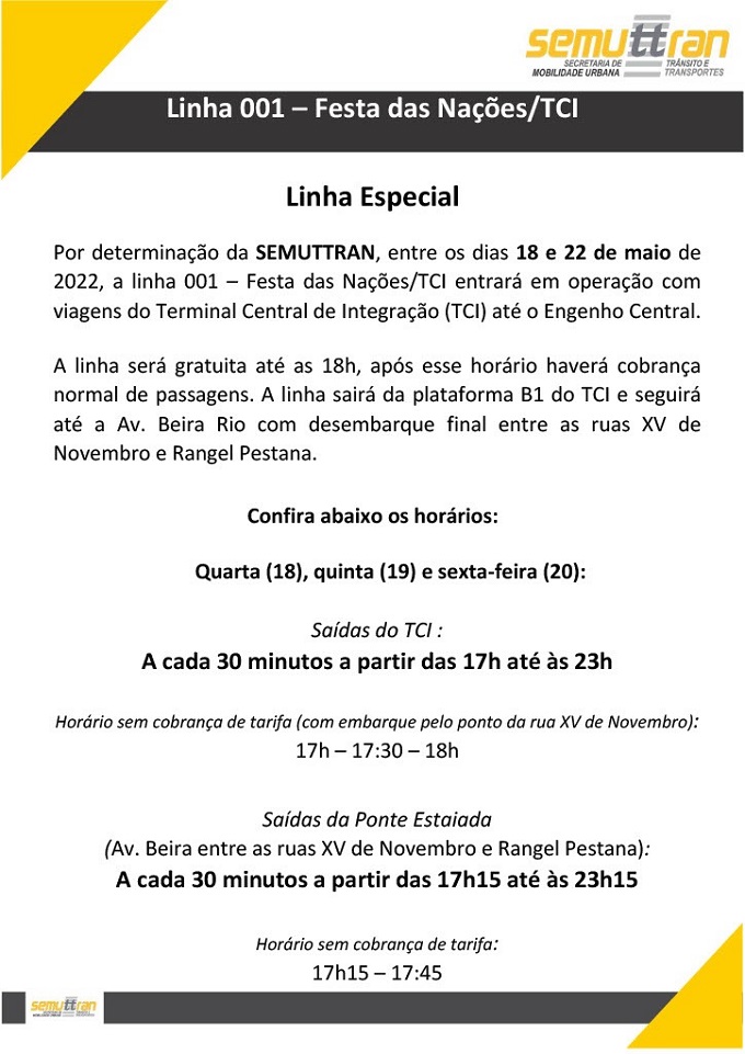 A Prefeitura de Piracicaba, por meio da Secretaria de Mobilidade Urbana, Trânsito e Transportes (Semuttran), disponibiliza a linha 001, de forma gratuita na maioria dos horários, para atender ao público da 37ª Festa das Nações de Piracicaba. A linha vai rodar entre os dias 18/05 e 22/05, com viagens do Terminal Central de Integração (TCI) – plataforma B1 – até o Engenho Central, a cada 30 minutos.