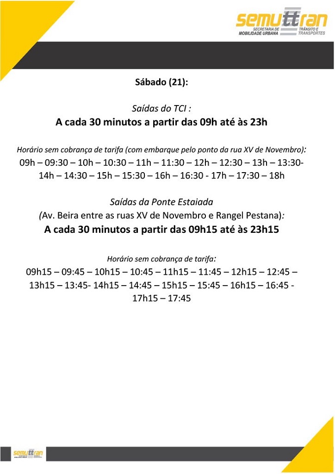 Hoje, quarta-feira, 18/05, amanhã, quinta-feira, 19/05, e sexta-feira, 20/05, a saída da avenida Beira Rio será entre os horários de 17h15 e 23h15, com intervalo de 30 minutos entre as viagens, com gratuidade até às 17h45.